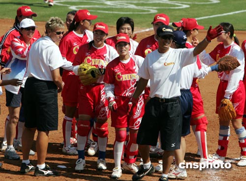 圖:中國女壘外籍教練與隊員慶祝勝利