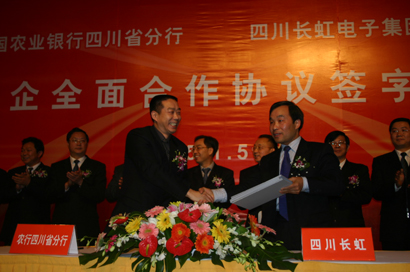中新四川網1月5日電(記者肖龍聯)中國農業銀行四川省分行與四川長虹電子集團有限公司今天上午在成都錦江賓館舉行銀企全面合作簽約儀式,農行將為長虹提供綜合授信三十億元人民幣,以幫助長虹克服反傾銷帶來的不利影響,支持長虹集團新一屆領導人確立的多元化、國際化發展戰略的實施。