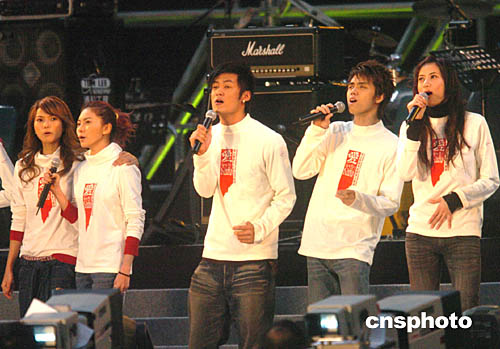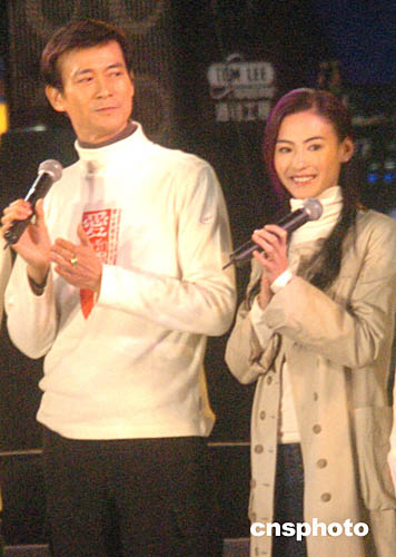 張柏芝、鄭少秋7日晚出席在香港大球場(chǎng)舉行的“愛心無國(guó)界” 兩岸三地新(加坡)馬(來西亞)演藝界大匯演﹐為南亞災(zāi)區(qū)籌款義演。中新社記者:趙振清