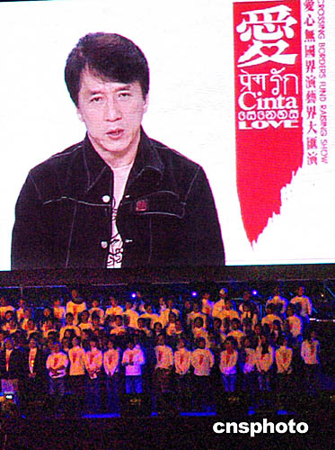 成龍7日晚出席在香港大球場(chǎng)舉行的“愛心無國(guó)界” 兩岸三地新(加坡)馬(來西亞)演藝界大匯演﹐為南亞災(zāi)區(qū)籌款義演。中新社記者:趙振清