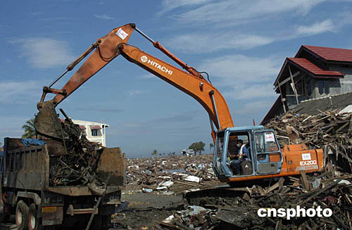 1月9日, 班達亞齊西部的洛阿村到市區(qū),清理廢墟的工作已經(jīng)加快。從洛阿村到市區(qū)的路上,一輛輛挖土機和鏟土機正在緊張地作業(yè),將破磚破木板以及雜物鏟到運輸車上。據(jù)醫(yī)療部門人士說,災難已經(jīng)過去十五日,如果不再及時清理死尸,很有可能爆發(fā)瘟疫。