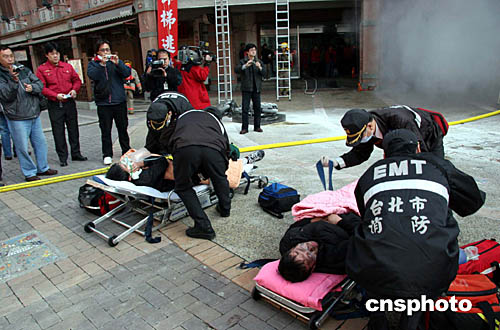 如果沒有各路媒體記者舉著“長槍短炮”從容地走來走去,沒有小小的人群悠閑地觀望,這種場面真會讓人以為一場火災正在發生。其實,“臺北年貨大街”就在這場演習中拉開序幕了。