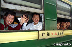 春運拉開帷幕,在廣東中山市打工的外來人員愉快登上廣州開往上海的三五○次春運臨時客車。今年廣州鐵路集團春運期間將安排一百四十二對臨客列車,接送返鄉(xiāng)過年旅客。作者:丁勇