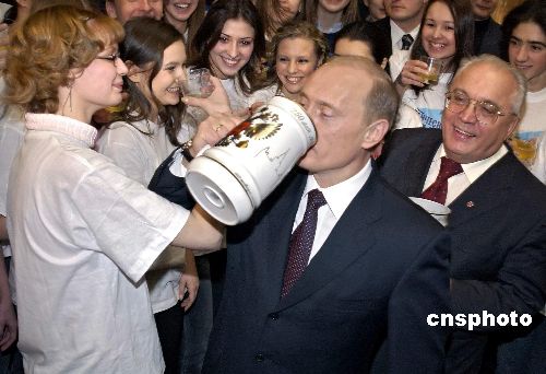 2005年1月25日,莫斯科大學隆重舉行成立250周年慶典活動。俄羅斯總統普京前來道賀,與學生們一起海量痛飲,共慶盛典。作者:Ic/cnsphoto