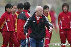 一月二十九日,中國女足在泉州對陣對陣德國隊前進行訓練。圖為中國女足技術顧問基斯·布倫特向女足隊員講解戰術。作者:盛佳鵬