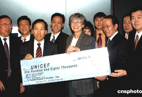 當(dāng)?shù)貢r(shí)間一月三十一日,美東華人社團(tuán)聯(lián)合總會(huì)和華人社團(tuán)聯(lián)席會(huì)向聯(lián)合國兒童基金會(huì)捐贈(zèng)了十八萬美元,用于救助東南亞海嘯災(zāi)民。聯(lián)合國兒童基金會(huì)執(zhí)行主任卡羅·貝拉米女士(中)代表聯(lián)合國兒童基金會(huì)接受捐款。作者:趙海燕