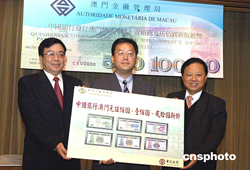 澳門金融管理局行政委員會(huì)主席丁連星、 中國(guó)銀行澳門分行總經(jīng)理張鴻義、中國(guó)印鈔造幣總公司總經(jīng)理賀林向人們展示三款澳門新版鈔票。