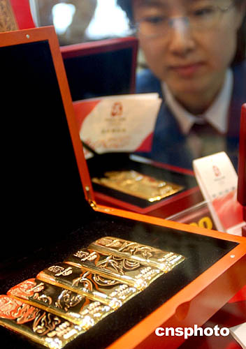2月4日,北京2008年奧運會會徽紀念性金條——“北京奧運金”在北京正式發售。這是百年奧運歷史上首獲授權的金條類特許產品。該金條成色達99.99%,4種規格分別為50克、100克、500克、1000克,全國限量發行2008公斤。作者:韓藝冰