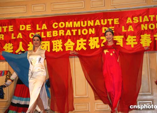 中國傳統春節大年初一,法國巴黎十三區政府會議大廳舉行團拜會,演員身穿中法兩國國旗在臺上表演,有如中法國旗飄揚在舞臺。作者:鐘誠