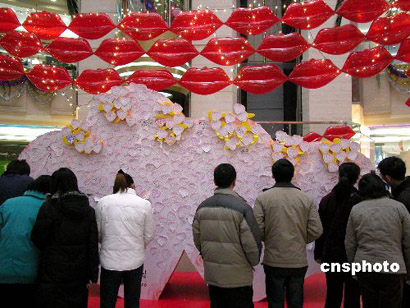 情人節(jié)前夕,錫城市場(chǎng)上的各種情人應(yīng)節(jié)禮品、紅色玫瑰等受到年青人的追捧。無(wú)錫一些商家推出的許愿墻上許心愿活動(dòng)異;鸨,對(duì)對(duì)情侶紛紛買來(lái)許愿牌、同心結(jié),寫上祝福貼在各種“心”形墻上,希望能將情意綿綿的情話捎給心愛(ài)的人。作者:潘正光