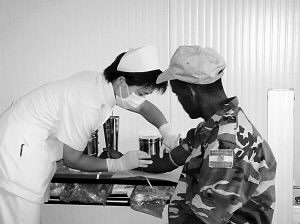 各項工作一展開,隊員們又發(fā)現(xiàn)了一項難題:語言溝通困難。盡管出征前她們都進行過英語的突擊訓練,但當?shù)厝丝谥械挠⒄Z相對于標準英語來說,有如廣東話和普通話的區(qū)別。為了盡快適應這里英語發(fā)音特點和習慣,女隊員們充分利用打針、護理的一切機會虛心學習,將醫(yī)療隊變成了一個“非洲英語角”。