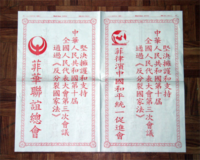 3月14日,《反分裂國家法》以高票通過后,菲律賓中國和平統(tǒng)一促進會、菲華各界聯(lián)合會、菲律賓晉江同鄉(xiāng)會、菲律賓中國洪門致公黨總部、菲律賓石獅同鄉(xiāng)會、菲律賓僑中學(xué)院等社團和文教單位,立即在各大華文報紙上刊登大幅套紅賀詞,堅決擁護和支持全國人大通過的《反分裂國家法》。