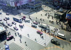 在道路東側,四五輛出租車斜在路口,記者問一名司機是否在等客,他焦急地回答:“等啥客呀,我在等路!”在他身邊,走在“斑馬線廣場”上的行人更顯愜意和悠閑!巴Ψ奖愕!甭啡撕蚺、馬先生都表示,“多寬綽啊,反正啥車到這都得慢行了!庇浾咦⒁獾,在“斑馬線廣場”的四周,沒有任何信號燈。