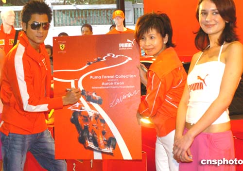 香港演藝紅星郭富城與香港太古資源有限公司董事總經理譚麗文21日在香港出席PUMA法拉利賽車系列推廣活動。作者:趙振清