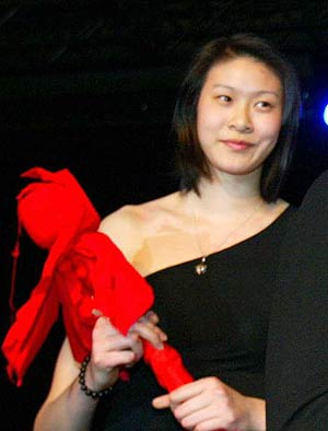 一襲黑色長(zhǎng)裙,露出半邊肩膀,是好萊塢剛流行過(guò)的式樣。趙蕊蕊顯然是無(wú)法習(xí)慣這樣性感的裝束,羞答答地上了臺(tái)。直到迎上帥哥索普贊許的眼神,更是露出一臉羞澀的笑容。“還真不習(xí)慣這樣穿,別扭極了。”說(shuō)話聲音一如平時(shí)的爽朗,“還是運(yùn)動(dòng)衣更符合我的氣質(zhì)。”這樣的曳地長(zhǎng)裙,還會(huì)再穿么?“也許不會(huì)了吧。”