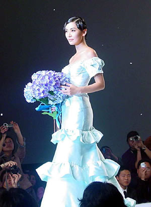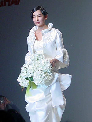 中新網3月24日電 據新聞晚報報道,昨天(23日)下午,在世貿商城的韓國時裝紡織博覽會上,韓國明星金素妍、鄭俊鎬身穿韓國頂級時裝大師AndreKim(安德烈·金)設計的最新服裝舉行了一場別開生面的婚紗秀,贏得了中國影迷的熱烈歡呼。下午三點,婚紗秀現場正式開放,爭相涌進的觀眾讓表演現場一時陷入癱瘓。主辦方不得不現場趕人,沒有邀請函的觀眾一律“清理”。當金素妍和鄭俊鎬雙雙出現在舞臺上時,歡呼聲伴隨著閃光燈爆發出來,出現了仿佛是搖滾樂演唱會的情景。特別是當鄭俊鎬輕吻金素妍前額時,一些女影迷當場流出了熱淚。