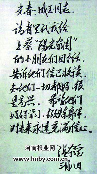 3月8日,溫總理收到來信后,欣喜地在信上批示:“光春、成玉同志:請省里代我給上蔡‘陽光家園’的小朋友們回個話,告訴他們信已收讀,知他們一切都好,很是高興。希望他們好好學習,鍛煉身體,對未來永遠充滿信心。”