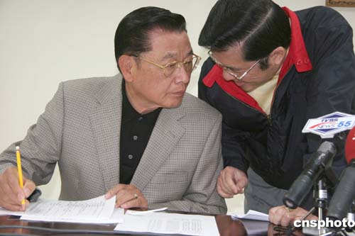 三月二十八日,中國國民黨副主席江丙坤率團(tuán)赴大陸參訪。圖為江丙坤(左)與同行的國民黨發(fā)言人張榮恭在一起商量行程。作者:董會(huì)峰