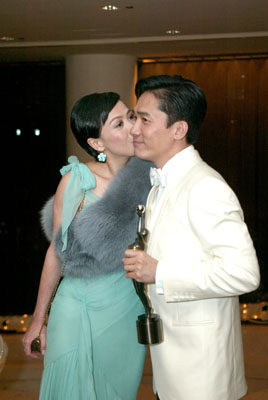 “偉仔”與嘉玲在頒獎禮結束不久即抵達慶功宴會場,五度稱帝的他一直面露笑容,上臺領獎時的緊張一掃而空,嘉玲更即場吻賀男友。“偉仔”解釋,他上臺時的心情就好像第一次拿獎一樣緊張,因他已因為《花樣年華》里的周慕云而奪得影帝,今次在《2046》里再演同一個角色,要能夠拿兩次獎,難度非常高。因此,他對獲獎感到十分開心,但同時又承認并不覺得太意外,因他之前已憑《2046》奪得香港電影評論學會的“最佳男演員”獎,自然也想再在金像獎得獎。對于成為五屆影帝,他只以“好彩”來形容,說自己運氣好,王家衛“腳頭”也好。另外,出爐影后章子怡繼續其“少話”本色,慶功宴上仍來去匆匆,不肯多談感受,只表示很開心,已經即時致電家人及朋友報喜。