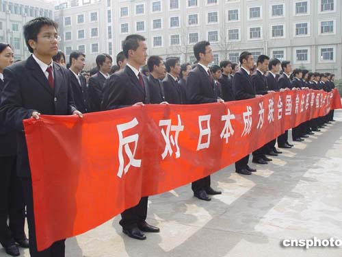 圖:學生們自發打起“反對日本成為聯合國常任理事國”的橫幅