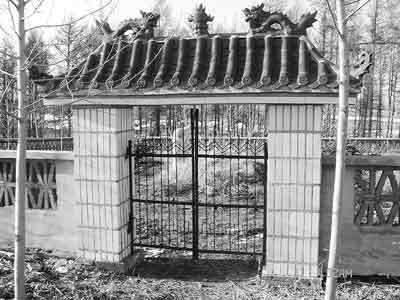 在青岡縣蘆河鎮擁軍村東北角約1公里處的一個小山坡上,一個用磚石砌成圍墻的大院格外引人注目。大門是鐵藝做成的,懸梁是綠色的琉璃瓦,上面雕刻著“雙龍戲珠”。據擁軍村的村民介紹,這里就是該村原村支書王國君家修建的祖墳。