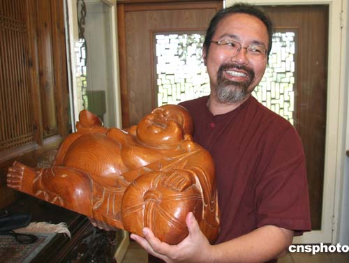 臺灣花蓮市古玩具店“畬歆閣”老板方永清,近日向中新社記者展示他收藏的三義木雕精品彌勒臥佛。苗栗縣三義鄉是木雕重鎮,三分之一人口從事木雕業,產品獨步臺灣全島。作者:董會峰