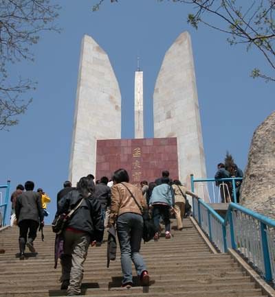 1984年為紀念孟良崮戰(zhàn)役在山上修建的紀念碑高30米,由三塊狀如刺刀的灰色花崗石筑成,象征著野戰(zhàn)軍、地方軍和民兵的武裝力量體制。底座為邊長20米、高1.6米的正三棱體,組成一個槍托,意喻槍桿子里面出政權(quán)。紀念碑的上下部構(gòu)成一個有機的整體,象征著軍民團結(jié)必勝,人民戰(zhàn)爭必勝。