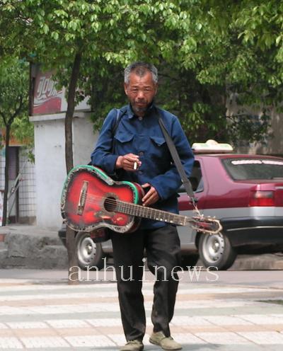 4月25日,記者在銅陵市育才路邊看到一位約有60歲的乞討者一改以往乞討人大多采用的二胡、小銅鑼傳統(tǒng)道具,身背吉他唱著流行的歌曲挨家挨戶進(jìn)行“表演”討錢。