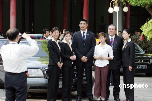 連戰(zhàn)的長子連勝文(右四)四月二十七日在南京參觀中國近代史遺址博物館時,與臺灣著名藝人、亞洲影帝柯俊雄(右二)以及當?shù)氐膶в涡〗銈円黄鸷嫌啊W髡撸好ㄜ?/div>