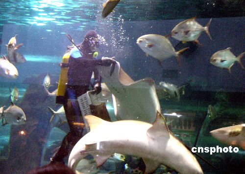 2005年5月6日,秦皇島新澳海底世界成為今年秦皇島“五一”黃金周海洋旅游線路的一處亮點(diǎn),每天下午的喂鯊魚(yú)表演,吸引了來(lái)自東北、唐山、天津、北京等地游客的目光。作者:李佳明