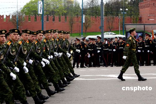 當(dāng)?shù)貢r(shí)間五月九日,閱兵方隊(duì)前往紅場參加俄羅斯紀(jì)念衛(wèi)國戰(zhàn)爭勝利六十周年慶典的閱兵式。作者:孫宇挺