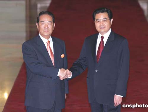 下午3時許,中共中央總書記胡錦濤與親民黨主席宋楚瑜在北京人民大會堂北大廳握手。這是中國共產(chǎn)黨和親民黨兩黨最高領(lǐng)導(dǎo)人首次會面。