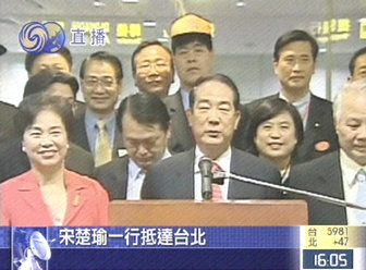 親民黨主席宋楚瑜一行抵達臺北。圖為宋楚瑜在機場發表講話。(電視截圖)