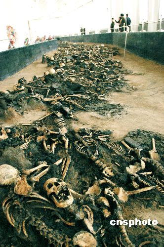 如今,在慘案現場建立的“平頂山慘案紀念館”內,已經實地挖掘出八百多具遇難同胞的骨骸。那是一幅無法想象的悲慘景象:燒焦的木頭,干癟的汽油桶,層層疊疊的尸骨,尸骨上還清晰可見深深的彈孔和刀痕。從一具具保持著匍匐爬行姿勢的遺骨,完全可以想象出遇難同胞臨死前的頑強與悲憤。最令人悲痛震撼的是一具懷著胎兒的母親骨骸,依稀可見小生命在母親腹中掙扎的慘狀。而在這具孕婦尸骨旁邊,竟還有一具襁褓中的嬰兒骨骸,一個出生不久的小生命竟遭受如此殘害毀滅,可見屠殺者的喪心病狂與無比殘暴。
