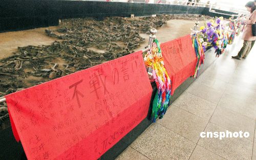 日本侵略者這種滅絕人性的殺戮行徑,令人神共憤,不僅讓中國人民刻骨銘心,也讓世界和平與正義人士義憤填膺。在“平頂山慘案紀念館”內,記者看到了許許多多來自日本的千紙鶴懸掛在遇難者遺骸的四周,這是日本“東日本鐵路工會代表團”等等那些日本和平正義人士敬獻給這些無辜遇難者冤魂的。“平頂山慘案紀念館”館長肖景全告訴記者,“平頂山慘案”遺址自上世紀七十年代開挖以來便不斷有日本游客前來參觀。三十多年來,已有數十萬人次日本人到撫順參觀“平頂山慘案”遺址紀念館。每一位目睹“慘案遺址”的參觀者,面對累累白骨,無不為當年日軍的殘暴所震驚。(完)