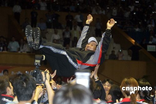 教練李永波在賽后被隊員拋起。作者:盛佳鵬
