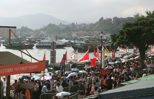 中新網(wǎng)5月16日電 據(jù)香港大公報報道,一年一度的香港長洲太平清醮會景飄色巡游昨日舉行,由于停辦了二十六年的“搶包山”活動今年復(fù)辦,令原來已很熱鬧的小島變得更熱鬧。今次飄色巡游有十多隊參加,每隊都有不同主題。據(jù)估計,活動吸引超過二萬人參與,其中由兩名小朋友扮演的曾蔭權(quán)和董建華最神似。