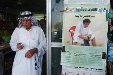 在巴格達的咖啡店,伊拉克人正在觀看一些阿拉伯衛星電視臺播放《太陽報》頭版刊登的照片,其中一張就是薩達姆只穿內褲站著的照片。《太陽報》還刊登著薩達姆在洗衣服、睡覺以及在獄中踱步等鏡頭。