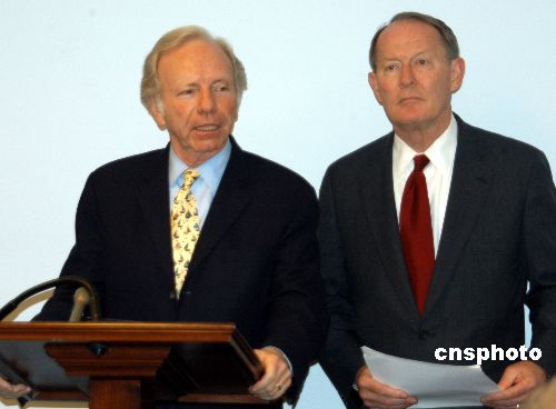曾在去年競選總統的美國參議員利伯曼(左)與另一名參議員亞歷山大(右),25日聯合提出旨在促進美中交流的“美中文化接觸法案”議案。他呼吁在國際事務中視中國為盟友,在商業活動中待中國為伙伴,加強與中國的接觸和交流,美國才會擁有燦爛的未來。作者:余東暉