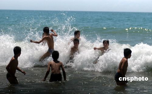 6月11日,海南博鰲16支龍舟隊冒著烈日在萬泉河入海口舉行精彩激烈的龍舟大賽,慶祝傳統佳節端午節。在博鰲海濱,不少村民攜兒帶女下海游泳,在端午節這一天俗稱洗龍水祈平安。作者:蒙鐘德