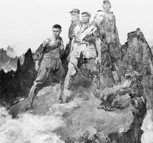 1941年8月,侵華日軍華北方面軍調(diào)集7萬余人的兵力,對晉察冀邊區(qū)所屬的北岳、平西根據(jù)地進(jìn)行毀滅性“大掃蕩”。9月25日,日偽軍約3500余人圍攻易縣城西南的狼牙山地區(qū),企圖殲滅該地區(qū)的八路軍和地方黨政機(jī)關(guān)。晉察冀軍區(qū)第1軍分區(qū)某部第7連奉命掩護(hù)黨政機(jī)關(guān)、部隊和群眾轉(zhuǎn)移。完成任務(wù)撤離時,留下第6班馬寶玉等5名戰(zhàn)士擔(dān)負(fù)后衛(wèi)阻擊,掩護(hù)全連轉(zhuǎn)移。他們堅定沉著,利用有利地形,奮勇還擊,打退日偽軍多次進(jìn)攻,斃傷90余人。次日,為了不讓日偽軍發(fā)現(xiàn)連隊轉(zhuǎn)移方向,他們邊打邊撤,將日偽軍引向狼牙山棋盤陀峰頂絕路。日偽軍誤認(rèn)咬住了八路軍主力,遂發(fā)起猛攻。5位戰(zhàn)士臨危不懼,英勇阻擊,子彈打光后,用石塊還擊,一直堅持戰(zhàn)斗到日落。面對步步逼近的日偽軍,他們寧死不屈,毀掉槍支,義無反顧,縱身跳下數(shù)十丈深的懸崖。馬寶玉、胡德林、胡福才壯烈殉國;葛振林、宋學(xué)義被山腰樹枝掛住,幸免于難。