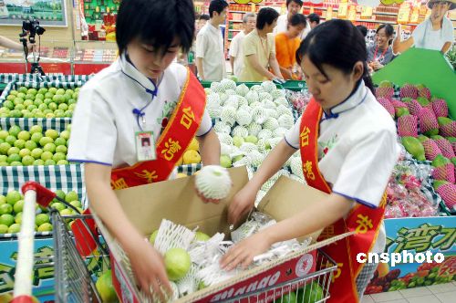 6月17日,濟南市大潤發超市的工作人員正往貨架上擺放臺灣水果,這也是零關稅的臺灣水果首次登陸濟南。本次引進的臺灣水果共有11個品種,其中9個品種是零關稅。作者:龔輝