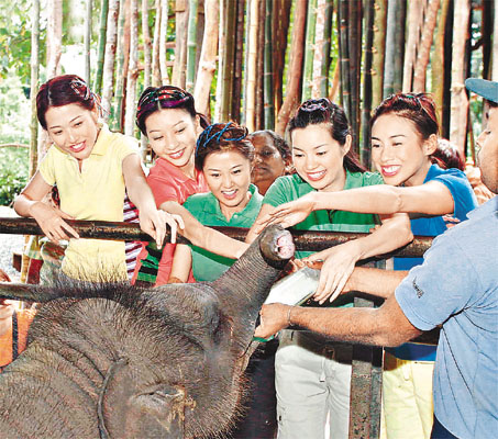 中新網(wǎng)6月21日電 據(jù)星島日?qǐng)?bào)報(bào)道,20位準(zhǔn)港姐昨日繼續(xù)在斯里蘭卡進(jìn)行拍攝,佳麗們被安排往“大象孤兒院”探訪,其間鄧上文與大象合照時(shí),竟被大象撩腳,嚇得她馬上彈開﹔至于葉翠翠則盡顯愛(ài)心,除了向大象喂奶外,見到現(xiàn)場(chǎng)的野狗時(shí)亦流露憐憫之色。