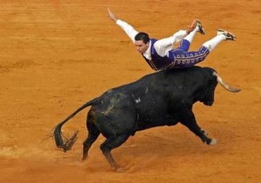 圖文報道:西班牙斗牛士正面飛身躍到公牛身上