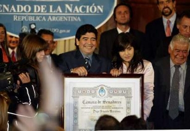 中新網6月22日電 走在紅地毯上,在眾多知名政客的簇擁下,阿根廷球星馬拉多納從阿根廷副總統兼參議院議長肖利手里接受了國會榮譽勛章。