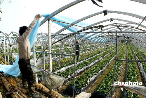 2005年6月29日,據財政部部長金人慶近日披露,到目前為止,已經明確免征農業稅的省份新增山西、內蒙古等19個,加上去年已經免征和基本免征農業稅的8個省份,2005年可提前實現免征農業稅的省份將達到27個,其余的河北、山東、廣西、云南4省(區)2005年有217個縣(市)也將免征農業稅。今年享受免征農業稅的農民將達到8億人。圖為寧波農村一蔬菜專業戶正在為大棚更換農膜。作者:張和平