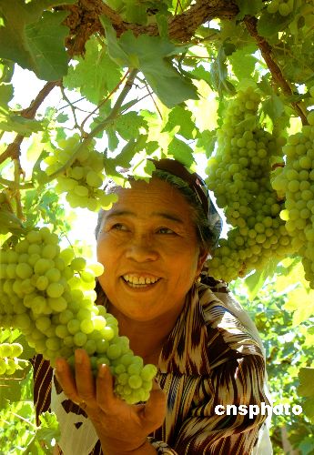 6月30日,吐魯番市亞爾鄉戈壁村葡農依色拉提·吾秀爾在采摘成熟的葡萄。素有“葡萄王國”之稱的新疆吐魯番,自6月下旬以來,種植的50萬畝無核白、紅葡萄、瑪奶子、翡翠綠、黑葡萄、玫瑰香、白布瑞克等500多個優良品種的葡萄相繼成熟并上市。據了解,2003年吐魯番葡萄獲得國家原產地域產品保護。作者:劉健4509