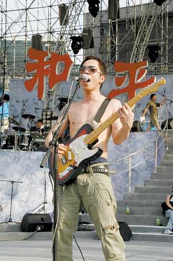 作為本場(chǎng)演出惟一的港臺(tái)歌手,黃貫中即將演唱的《游擊隊(duì)之歌》格外引人注目。昨天,在場(chǎng)的觀眾終于見識(shí)了這支搖滾版的《游擊隊(duì)之歌》。為了讓自己的彩排更加盡興,黃貫中索性赤膊上陣,光著上身挎著吉他和他首次亮相的“汗”樂隊(duì)賣力地演唱。