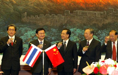 圖:溫家寶與泰國總理塔信出席中泰簽約儀式