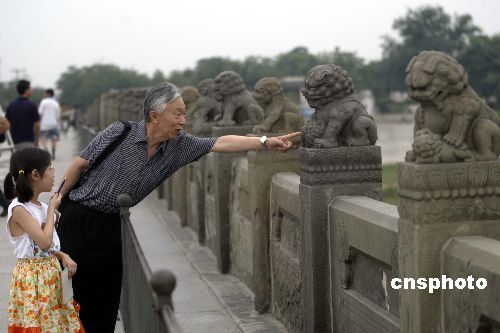 七月七日,一位花甲老人在昔日的抗日戰場——北京盧溝橋向孫女介紹抗戰歷史。當日“偉大勝利——紀念中國人民抗日戰爭暨世界反法西斯戰爭勝利六十周年大型主題展覽”在北京宛平城內的中國人民抗日戰爭紀念館正式開展,城外盧溝橋,也迎來了不少緬懷抗日戰爭中英雄的市民。作者:盛佳鵬